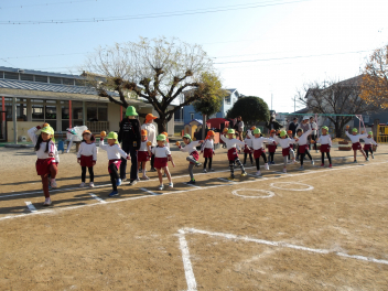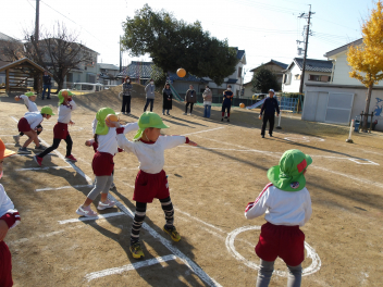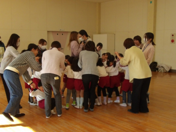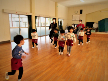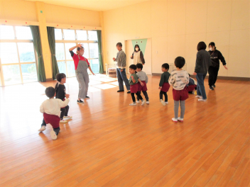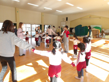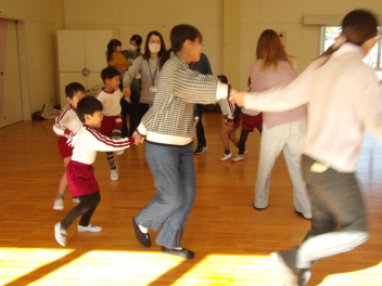 年長年中さんは、近くの子と手を繋いでグループになり、最終的には友達とグループを作って一つの大きな輪になって遊びました