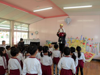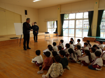 午後には、避難訓練を行いました。今日の避難訓練は“幼稚園に不審者が来た場合”どのように避難するか、を想定して行いました。警察署の方に不審者役をやってもらい、実際に避難しました。こどもたちは職員の指示に従い、さっと部屋に隠れることができました。その後、警察署の方に「いかのおすし」の合言葉など、こどもたちが身を守る講話をしていただきました。