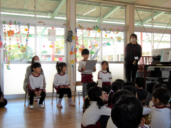 園長先生が映像で2学期の様子の写真を写しながらお話をしてくれました。2学期は特に運動会や遠足、発表会など大きな行事がありました。自分たちの写真を見ながら、楽しかったこと、頑張ったことなどなど、いろいろな思い出を振り返えることができました。いろいろな経験がこどもたちの成長につながったと思います。