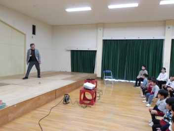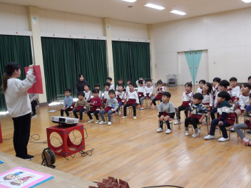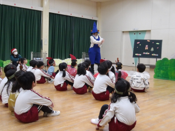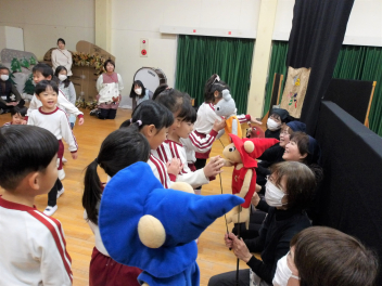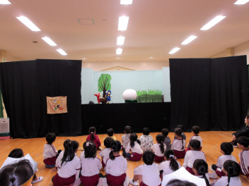 12月の誕生会のお楽しみは「人形劇サークルかみふうせん」さんによる人形劇です演目は“ブレーメンの音楽隊”と“ぐりとぐら”です。素敵な人形劇が繰り広げるお話の世界に引き込まれるこどもたち。人形が動いたり、踊ったりするたびに喜んでいました