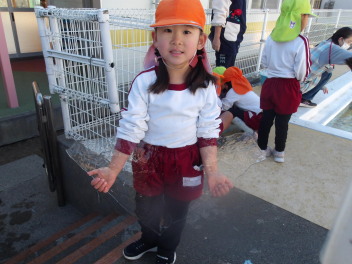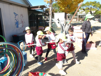 今朝は冷たい風が吹いていましたが、次第に風がおさまりお掃除日和になりました。学期末恒例のおもちゃ小屋を年長組、年中組、年少組みんなでやりました。