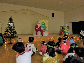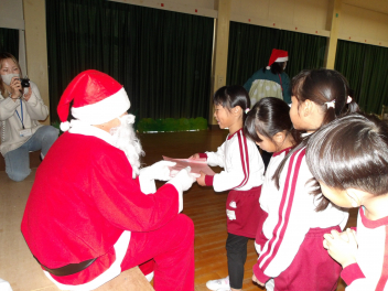 先生のお楽しみが終わるころ、、、みんなのところにもサンタクロースが来てくれました