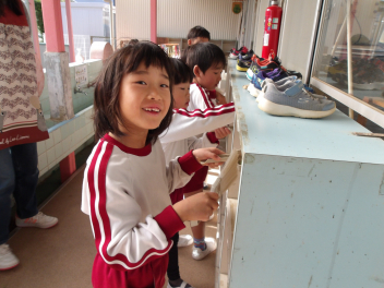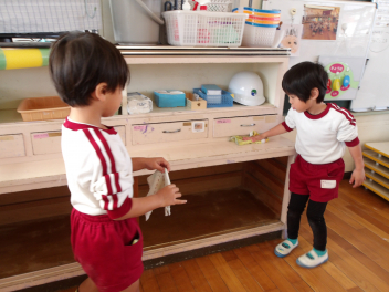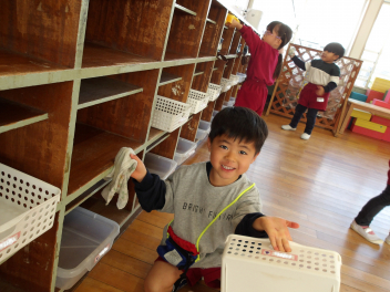 年長さんたちが、おもちゃ小屋の中にあったものを全部出してくれました。それをみんなで拭き掃除をして、ピカピカにしました。3学期も楽しく遊べるといいですね
