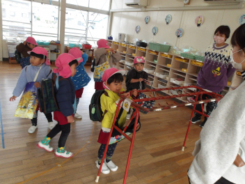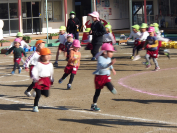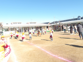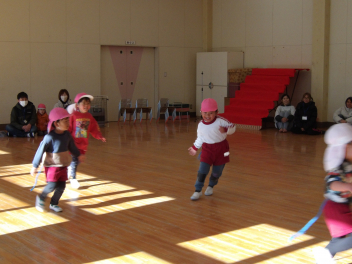 年少うさぎ組は、遊戯室でしっぽとりの様子を参観してもらいました。自分のしっぽがとられないように必死で逃げる子、友達のしっぽを狙って一生懸命走る子などいろいろな様子でした