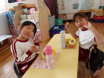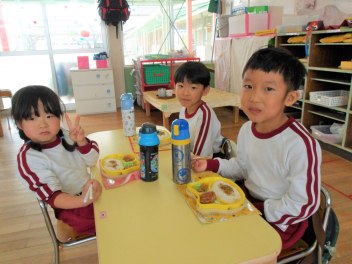 いつもより大きな机と椅子でご飯を食べました年中さんになったみたいで嬉しそうですsad