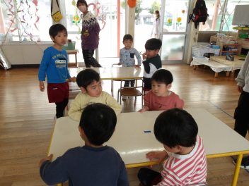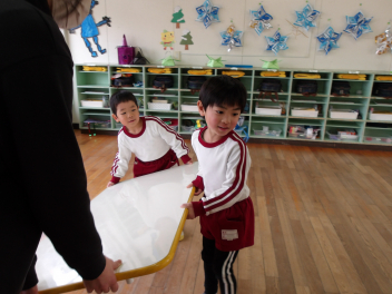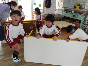 年少さんは年中組へ入りました。年中さんは机を自分たちで用意するので、うさぎ組さんもやってみました
