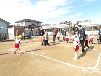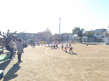 年中ひまわり組は、戸外でしっぽとりの様子を参観してもらいました。まずは白色帽子チームと色帽子チームに分かれて、こども同士の対決です