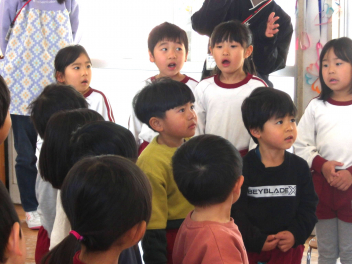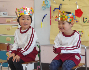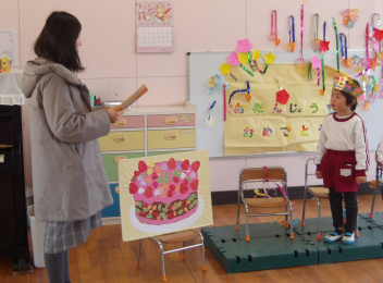 今日は誕生会です。みんなで、2月生まれのお友達と1月の誕生会でお祝いできなかったお友達の誕生日をお祝いしました。