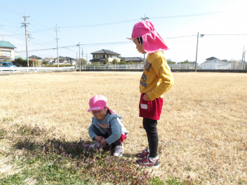 道端にもホトケノザやオオイヌノフグリなどの春の草花が咲き始めました。小さな春を見つけては「見て、見て!」「かわいいね!」と喜ぶうさぎ組でしたblush