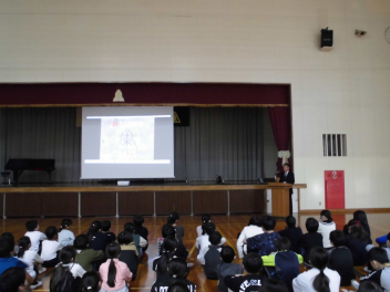 本日、開校150周年の節目を全校児童で祝い、愛校心を育むために「150周年を祝う会」を体育館で実施しました。