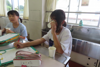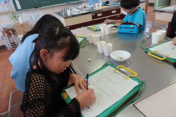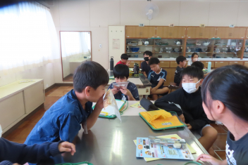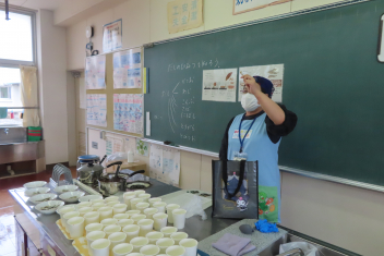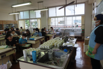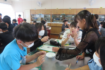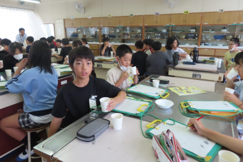 5年生は、家庭科で「だしのひみつ」について、栄養教諭を講師に招いて学習しました。まずは、事前学習で調べただしについて話し合いました。次に、主に使われることが多い「かつおぶし」「こんぶ」「にぼし」「しいたけ」の実物をみせていただきながら、だしの取り方を教えていただきました。そして、今度の調理実習に使う「にぼし」の観察をしました。それから、「だし入り」と「だしなし」の味噌汁を味見しました。「だし入りの方が、味が濃くておいしい。」と言っていました。次回は、自分たちでにぼしでだしをとって味噌汁を作ります。おいしく作れるといいね。