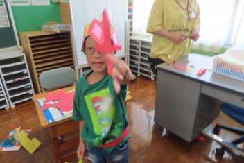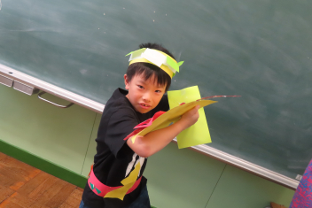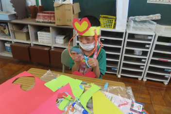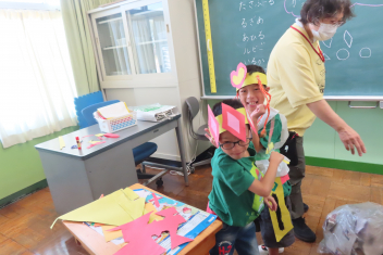 りゅうち学級の2年生は、図画工作科の学習で「わっかでへんしん」の仕上げをしました。作ったものを身に付け、もっとよくするには何を作るとよいか考えました。紙と紙を重ねたり、紙に模様をつけたりしました。楽しんで活動することができました。