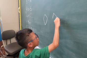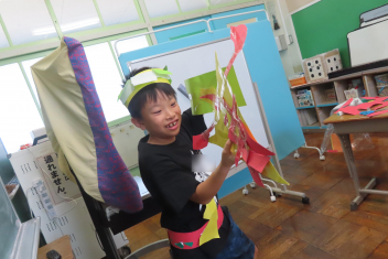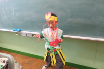 •  1年生は、国語科で「やくそく」という物語の学習をしています。場面に合わせた会話文の読み方を工夫することができるようペープサートを動かし、あおむしはどんな気持ちだったかを想像していました。「葉っぱを食べられて怒っている気持ち。」「自分が先にちょうになりたいから葉っぱを食べないでという気持ち。」「自分と同じあおむしがいたからびっくりした気持ち。」などと発表していました。みんなと学習することで、考えが広がっていきました。
