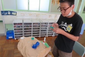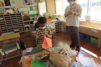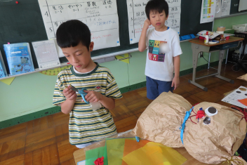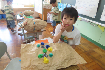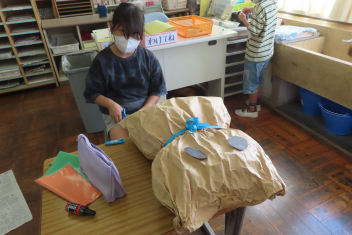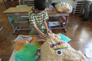 りゅうち学級の図画工作科で「くしゃくしゃぎゅっ」の学習をしました。大きな袋をくしゃくしゃにしてやわらかくした後、その中に新聞紙を丸めて入れました。ぎゅっと抱きしめたいものを想像し、それに近づくように目やひれを付けました。リボンやお花紙などを切ったり、貼ったりしているうちにだんだんと愛着がわいてきたようです。