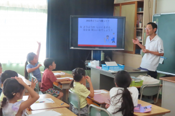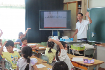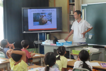 2年生は、国語科で「どうぶつ園のじゅうい」の学習をしています。浜松市動物園のじゅういさんと教科書のじゅういさんの仕事は同じでしょうか。違うことがあるのでしょうか。浜松市動物園のじゅういさんに来ていただき、動物園の様子や仕事内容、うれしいことや大変なことなどについて教えていただきました。説明だけでなく、動画もクイズもあって楽しく学習することができました。お忙しい中、ありがとうございました。