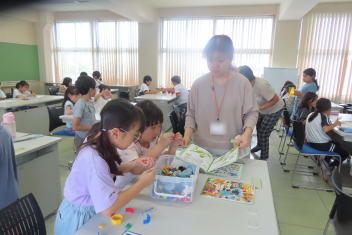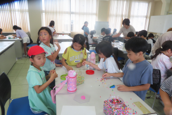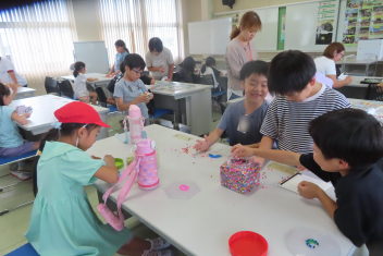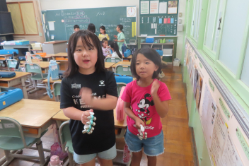 2年生は、図画工作科の学習で、廃材を使った楽器作りをしました。箱やトレーに輪ゴムをつけてひっかくとギターに。ペットボトルやびんに石やビーズを入れて振るとマラカスに。いくつかの箱とカップ麺やプリンなどの容器を組み合わせラップの芯でたたくとドラムに。自分がイメージした楽器を作って鳴らして楽しそうでした。