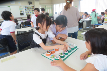 1年生は、図画工作科の「粘土で作ろう」の学習をしました。粘土をこねたり、ちぎったり、丸めたりしながらアイデアを膨らませ、作品を作りました。友達と見せ合って一緒に遊んだり、よいところをほめたりしていました。自分の作品にうっとりしている子もいて、楽しそうでした。