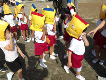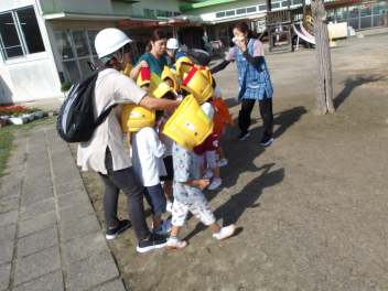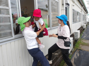 全員が避難できたことを確認して、今日は窓から小学校へ避難する訓練をしました。