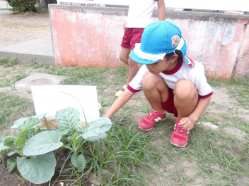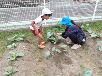 中には、園の畑に自分たちが植えた冬野菜の様子を先生と見ている子もいました。