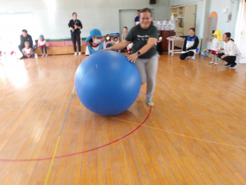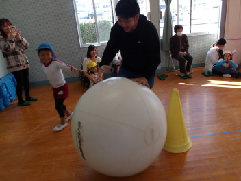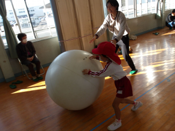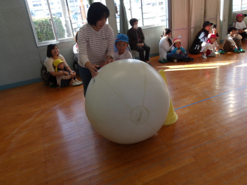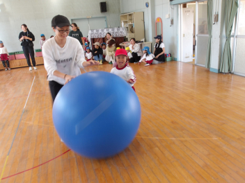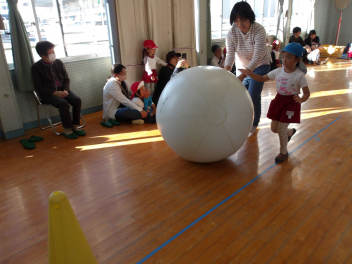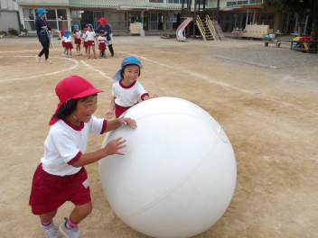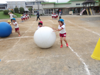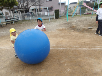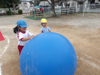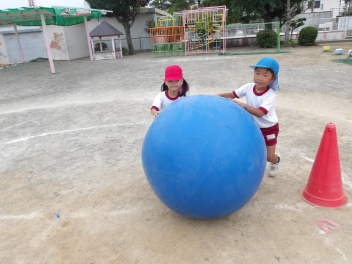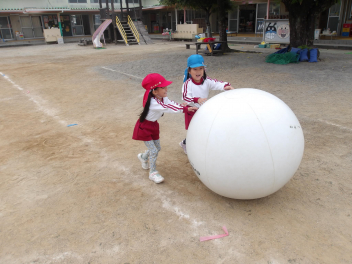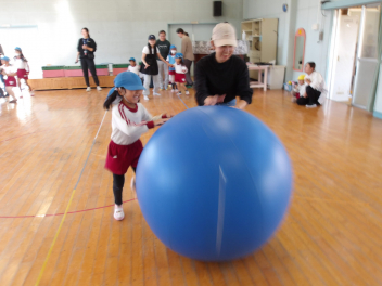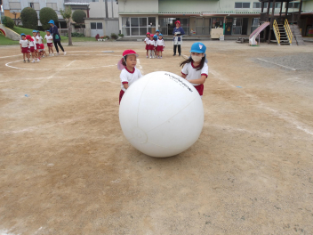 たんぽぽ組、ばら組のこどもたちは、初めてやる大玉転がし、とても楽しそうにやっていました。
