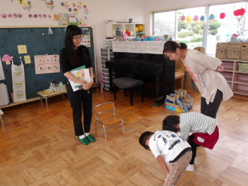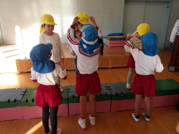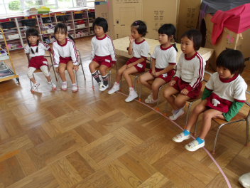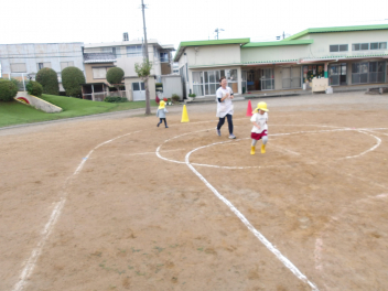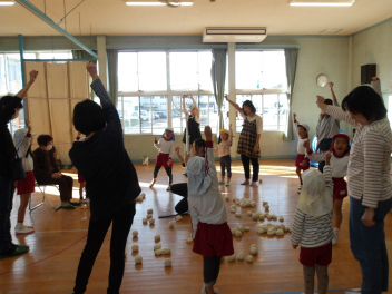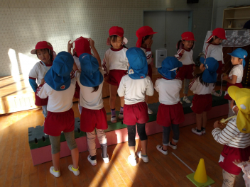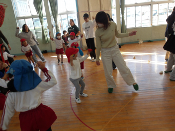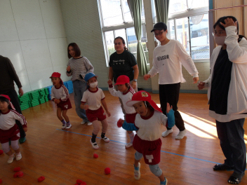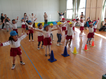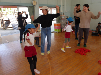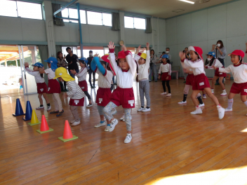 赤組、白組に分かれて、「ジャンボリミッキー」の曲に合わせてやりました。