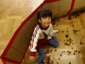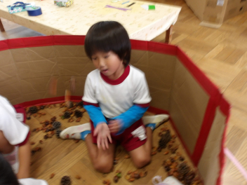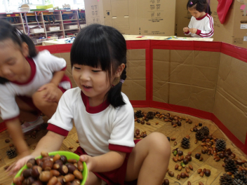 ドングリプールの中には、いろいろな種類のドングリがありました。ドングリだけではなくて、マツボックリもありましたよ!