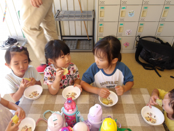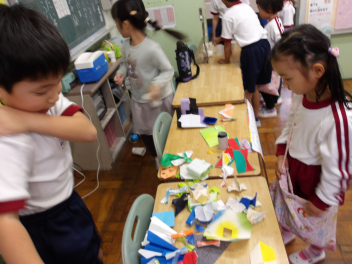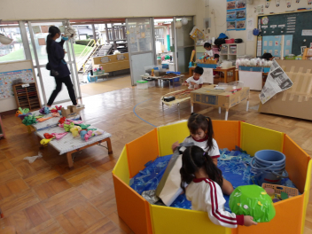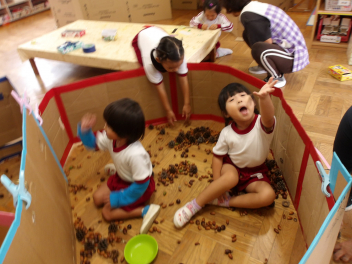折り紙を折って遊んだり、ままごとをして遊んだり、ドングリプールをつくって遊んだり…