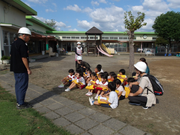 最後に遊戯室に集まって、今日の避難訓練について、担当の先生と園長先生よりお話がありました。