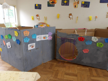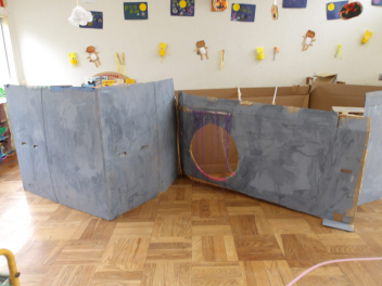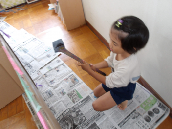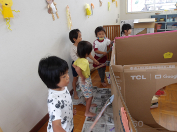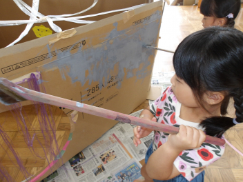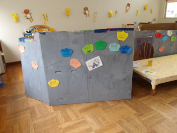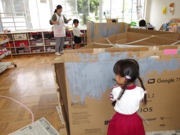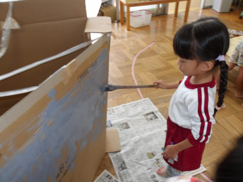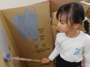 ばら組の保育室では、忍者屋敷の壁を灰色の絵具で塗っていました。