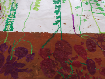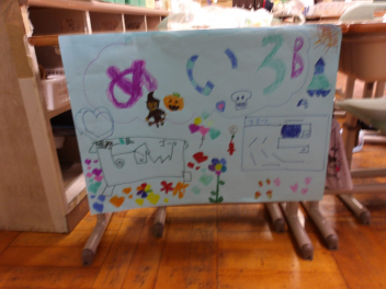 あじさい組のこどもたちは、昨日のサツマイモ掘りの絵をかいていました。