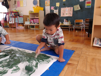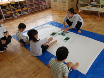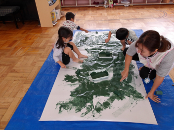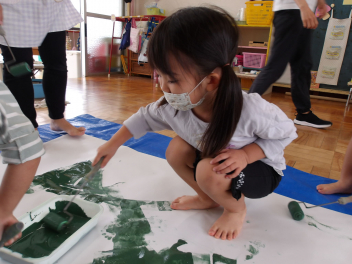 たんぽぽ組の3人は、大きな白い模造紙にローラーを使って、緑色の絵具を塗りました。