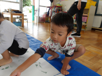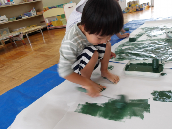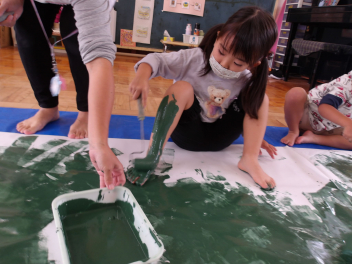 途中、楽しすぎて、自分の足にローラーを走らせて、緑色にしてしまった子もいました…
