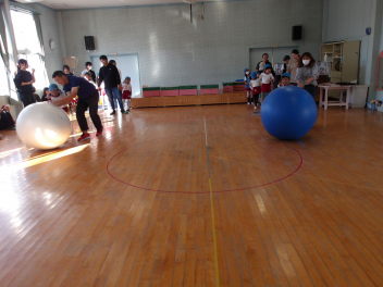準備運動が終わったら、早速、「大玉転がし」から行いました。