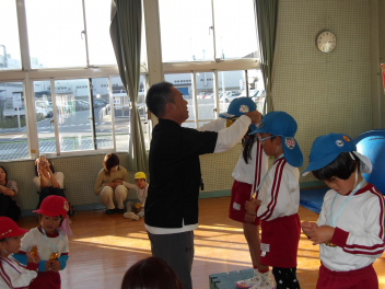 2種目が終わった後の閉会式では、年長組のこどもたちが、年少、年中組のこどもたちのためにつくってくれた金メダルを、授与してくれました。