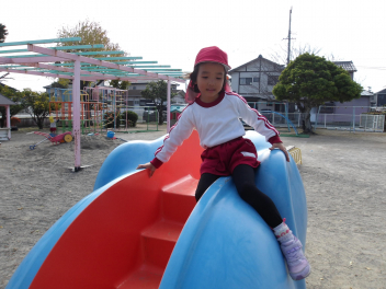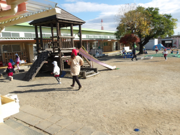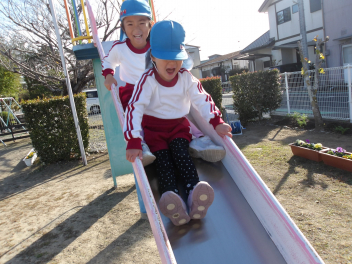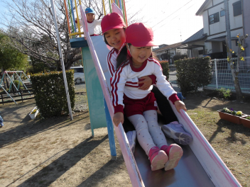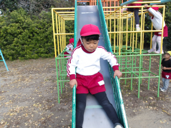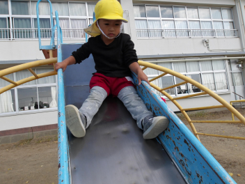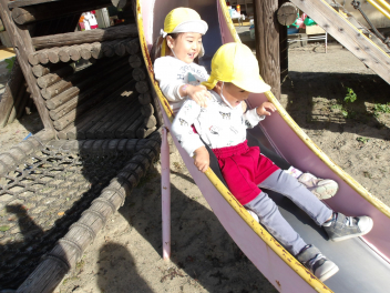 大きな滑り台では、年長さんと年中さんが一緒に遊んでいました。