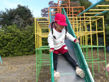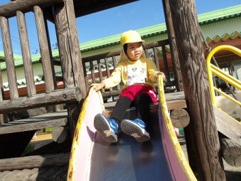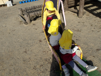 木製遊具の滑り台で、年少さんの3人が、仲良く滑って遊んでいました。