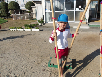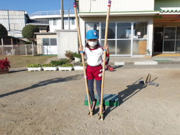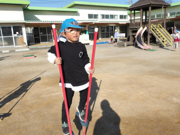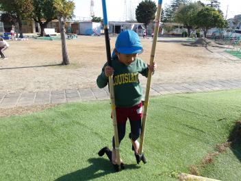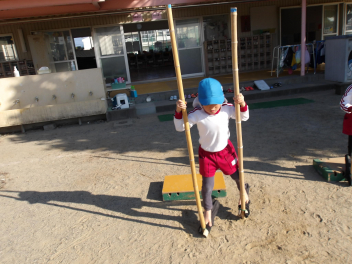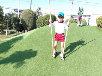 今、年長組のこどもたちが頑張っているのが、竹馬です。