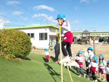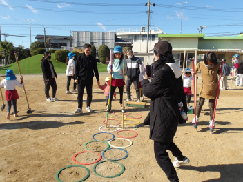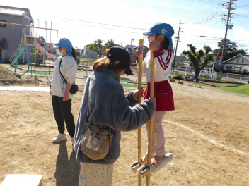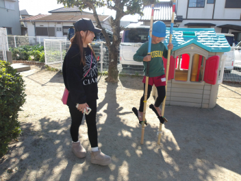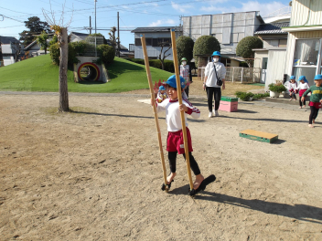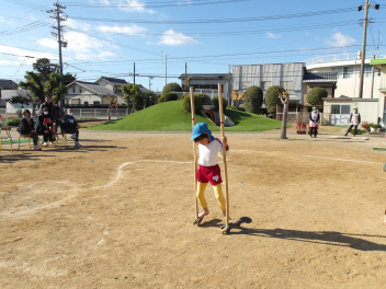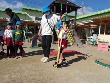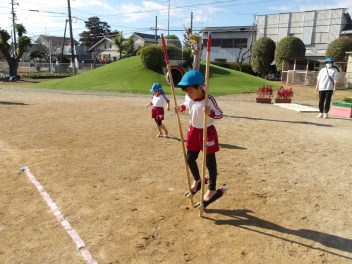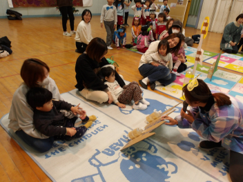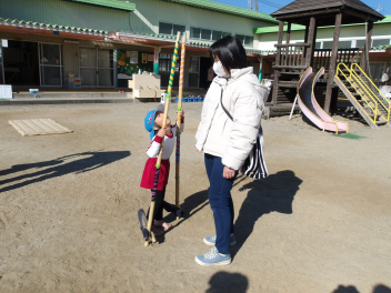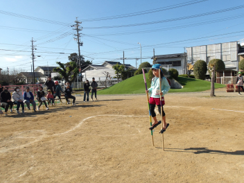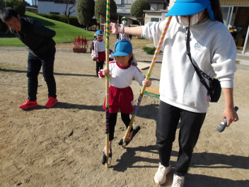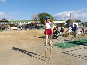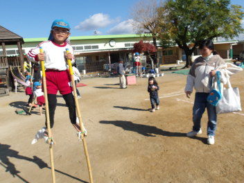 こどもたちは、おうちの方たちに、得意そうに竹馬に乗る様子を見せていました。中には、一緒に乗って楽しんでいるお母さんもいて、とても充実した時間になりました。