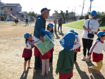 お話の中で、20人の園児の2学期に頑張ったこと等を写真を見せながら紹介してくれました。