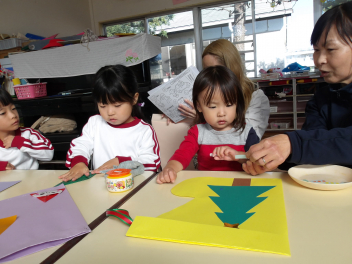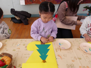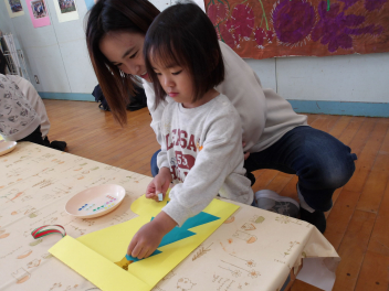 • 今日は、地域の方を講師に迎え、年長組のこどもたちが、親子でリースづくりに挑戦しました。