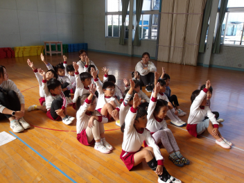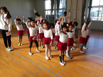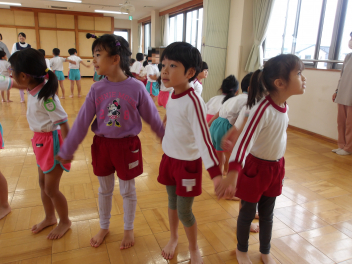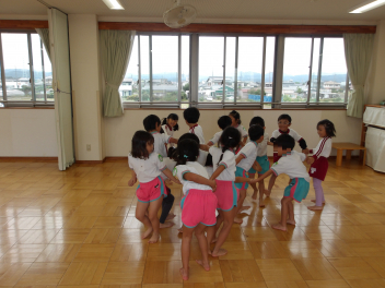 5つのグループに別れてやりましたが、だんだんにグループ同士をくっつけていき、最後は一つの輪になってやりました。