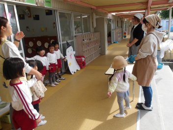 公園の近くにある、ばら組のお友達のおじいちゃん、おばあちゃんのおうちから、おじいちゃん、おばあちゃんが出て来てくださり、手を振ってくださいました。