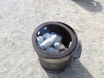 アルミホイルで包んだら、いよいよ、包んだ芋をおくどの中にいれます!!