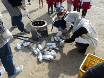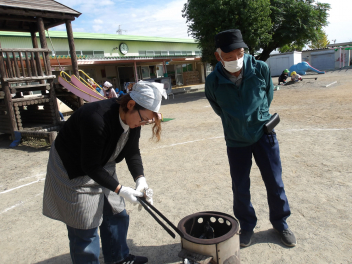 焼き芋パーティーに招待した、畑を貸してくださった地域の方も来てくださり、焼き芋の焼き具合を見てくださいました。