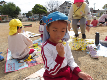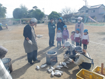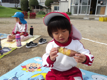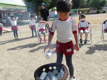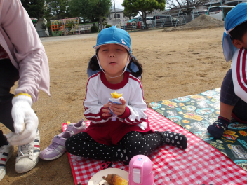 焼き芋が美味しそうに焼けたので、園庭でみんなで食べることにしました。