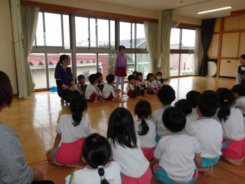 • 今日はあじさい組が、「子育てセンターなかぜ」の年長組さんとの交流の日です。