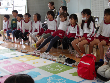 の放送に敏感に反応し、担任の先生の指示を受けるとすぐに靴を履き、園庭に集合して来ました。