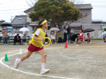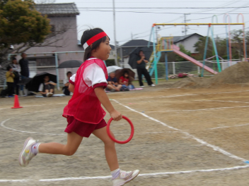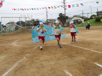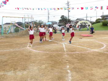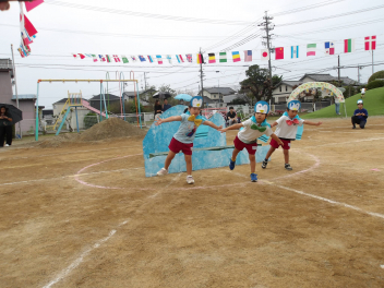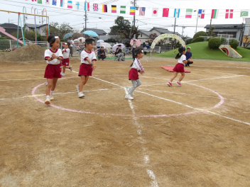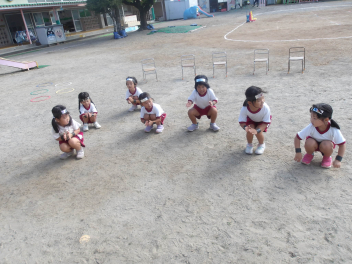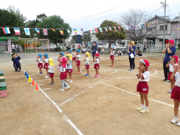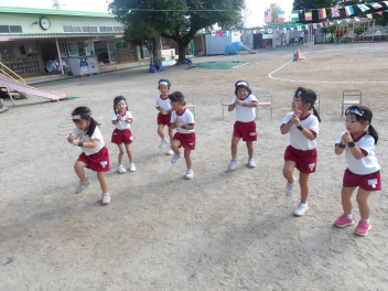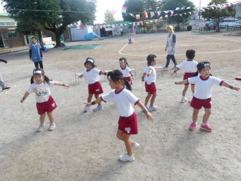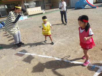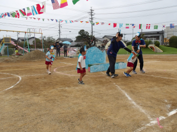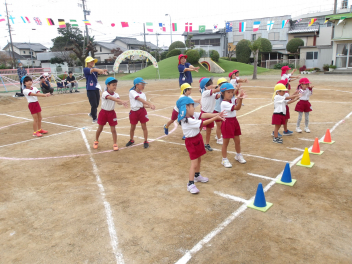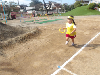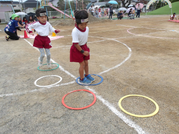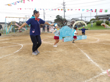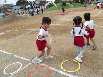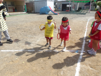 フラフープを使った電車ごっこも先生と一緒にやっていました。