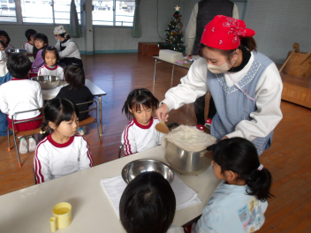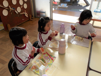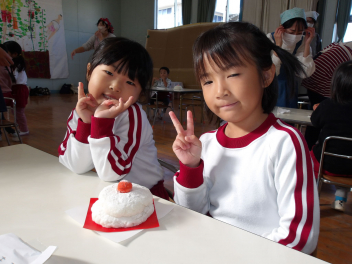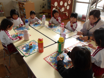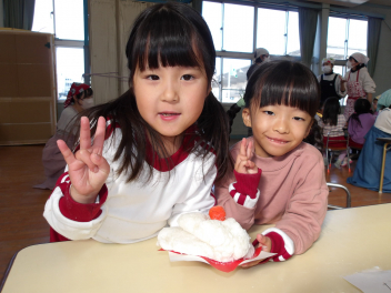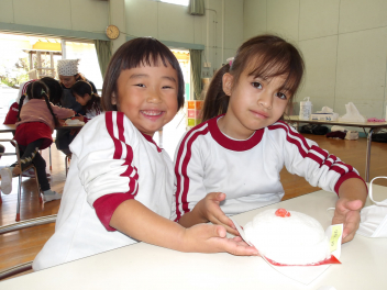 クリスマス会が終わった後は、クラスの保育室へ帰って、みんなでクリスマスケーキを食べました。