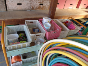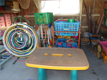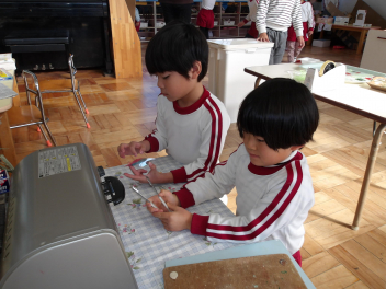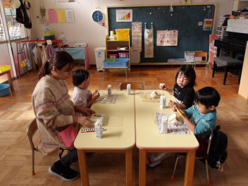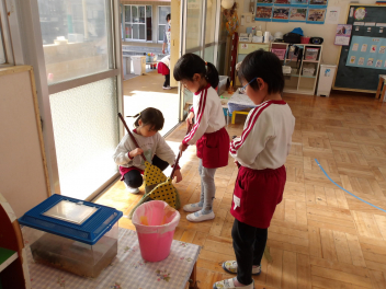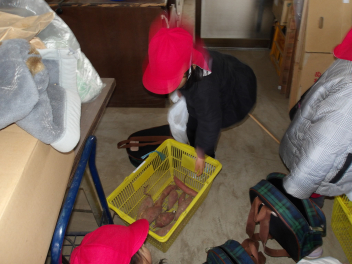 年中組さんの7人は、遊戯室で明日の「干し芋づくり」の準備をしていました。